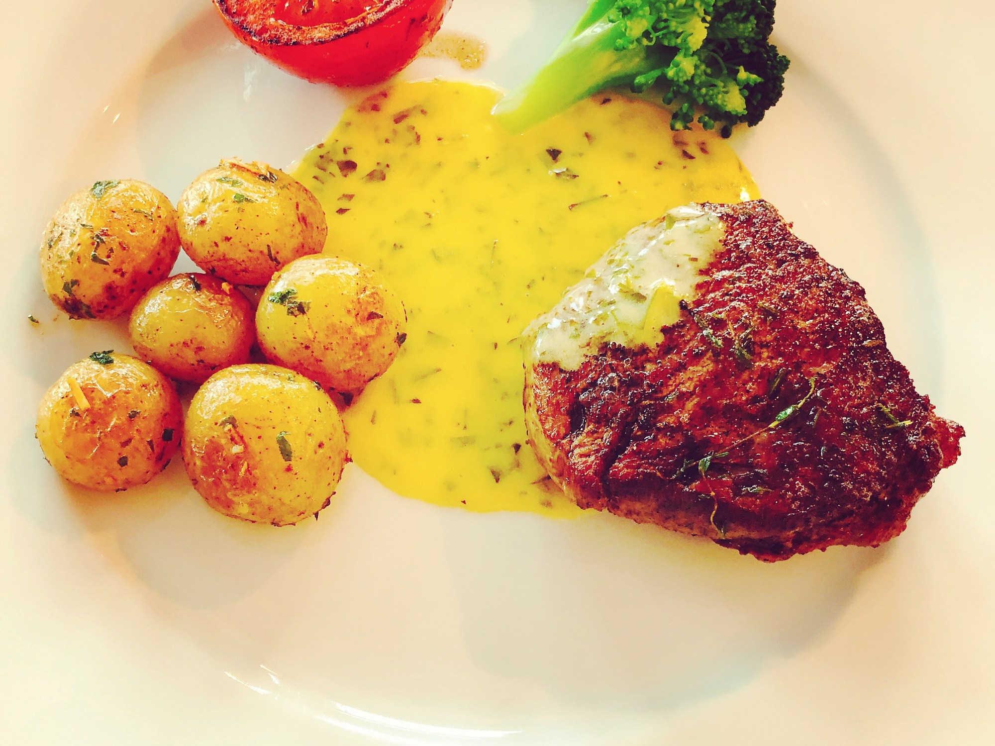 Sätt stekpannan på medel hög värme och ha i smöret. Inte för hög värme smöret skall inte bli bränt. Ha i timjan och vitlöksklyftorna. Lägg i biffarna och stek dem på bägge sidorna. Vänd dem ofta och ös smöret över med en sked. När de är klara så ta ur biffarna och låt dem vila.